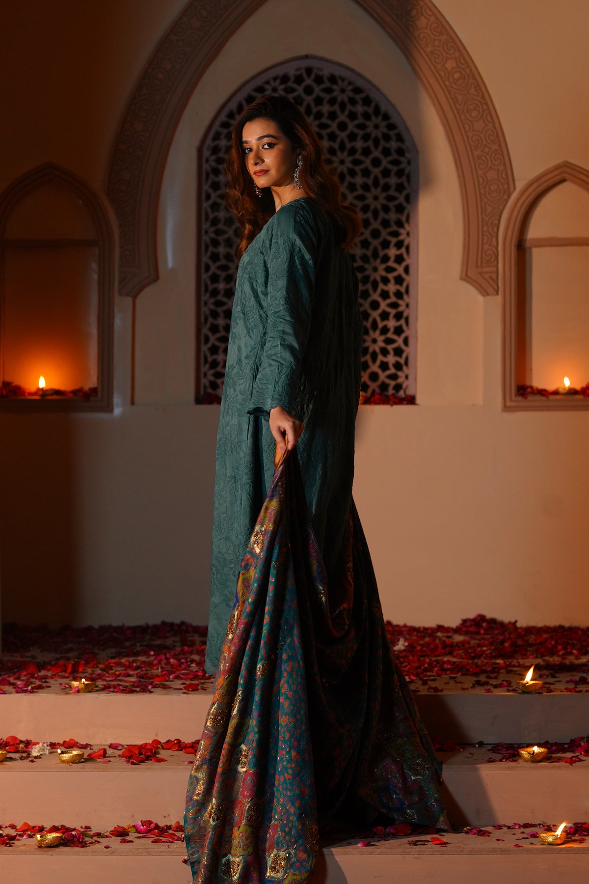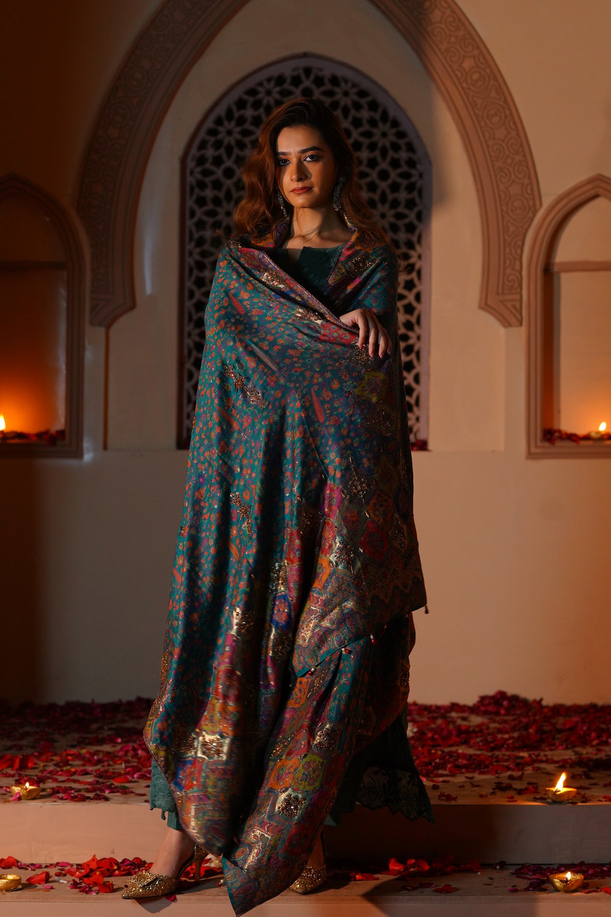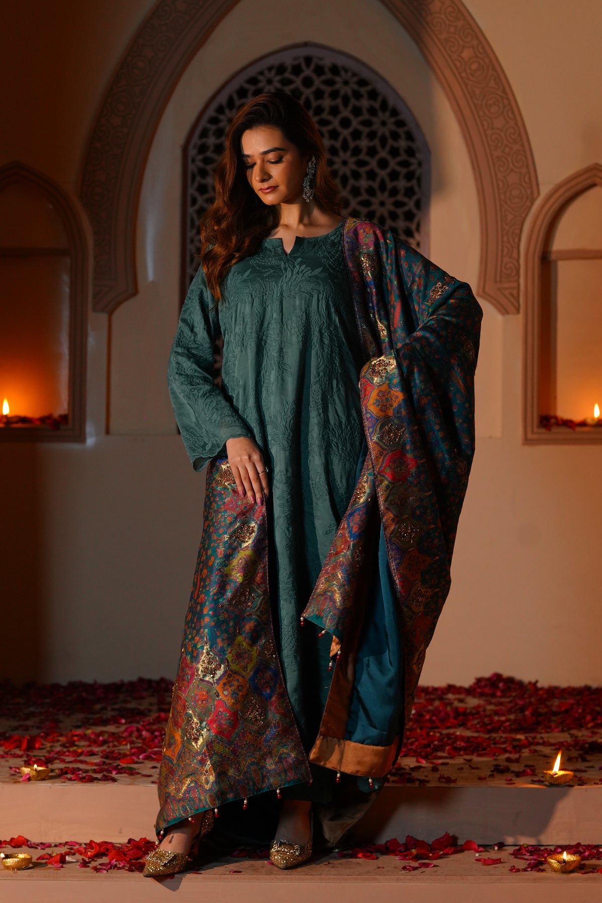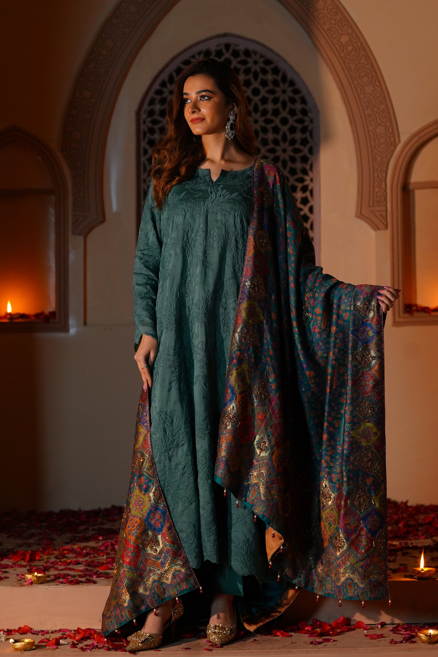 This long shirt in sea green silk carries a fluid, elongated fall. The surface is fully embroidered in tonal hues, finished with delicate scalloped edges that define the silhouette. The richness of silk allows the detailing to sit with ease and clarity. Straight-fit silk trousers complete the look with balance. Paired with a matching kani wool shawl, woven in the same sea green palette for a composed finish.