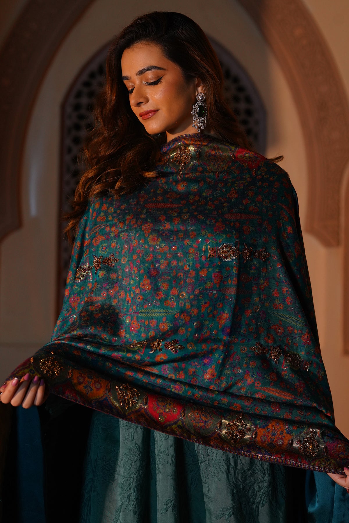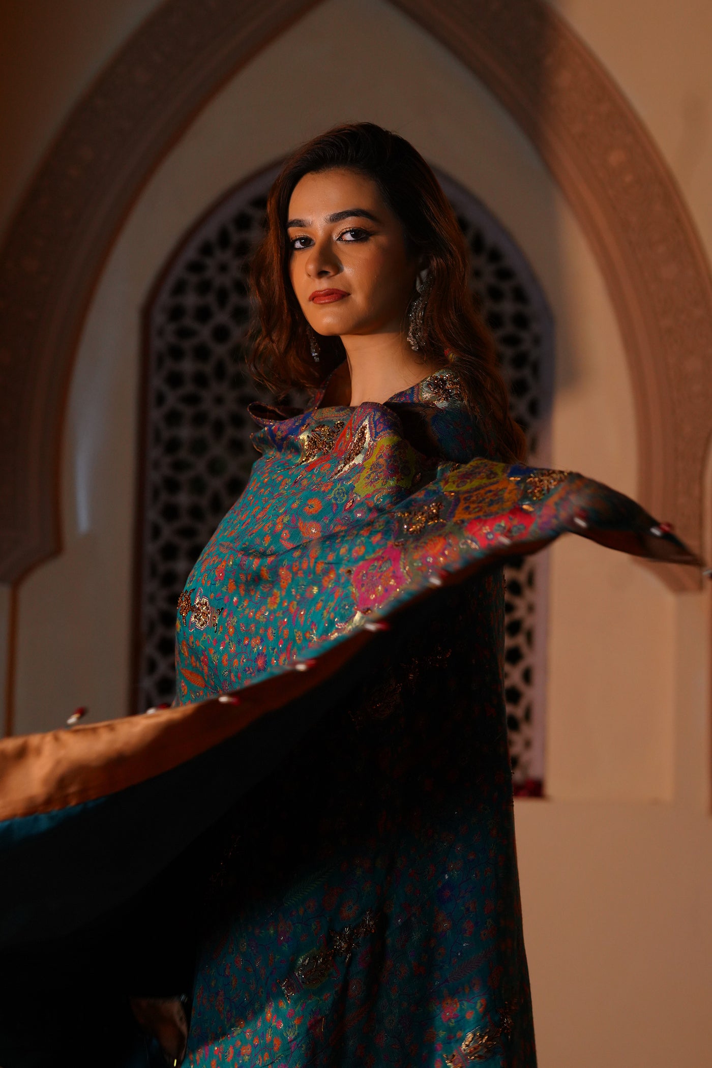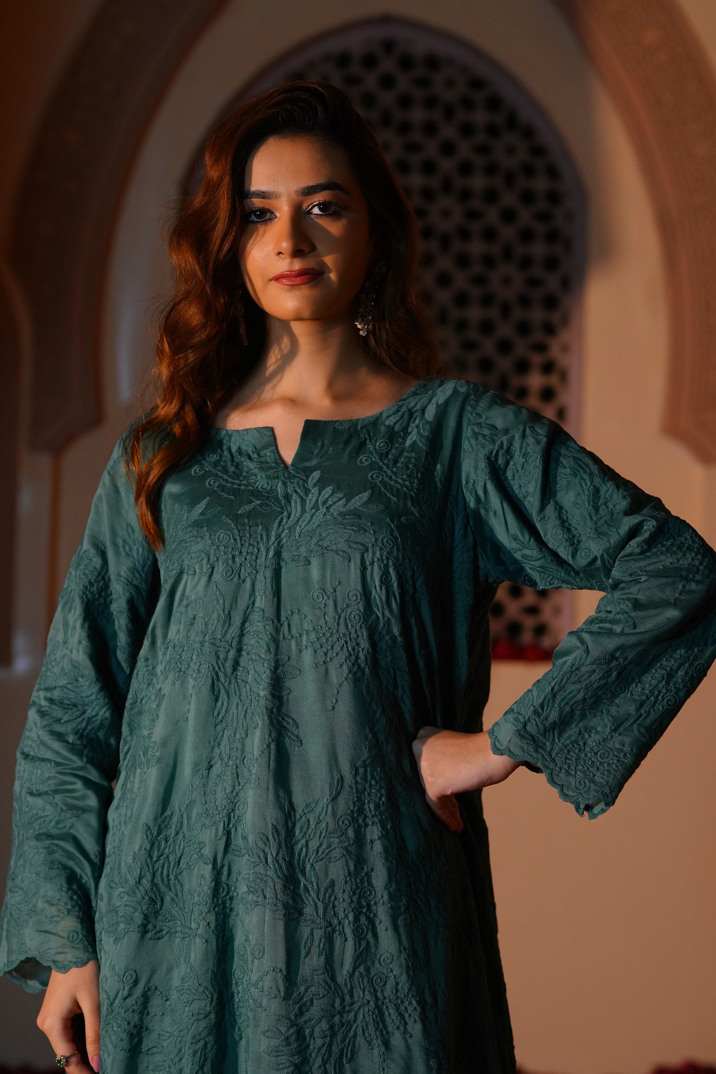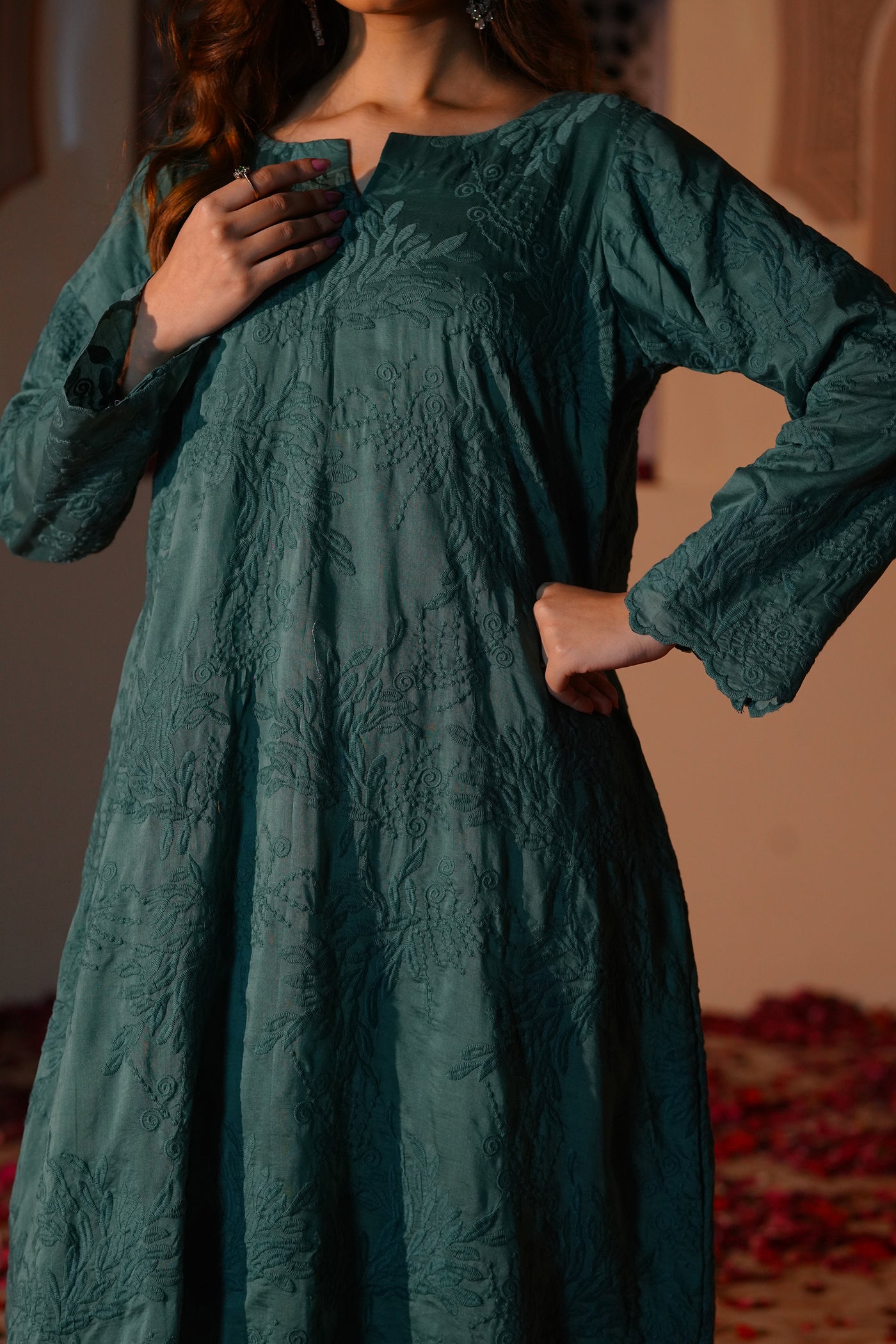 This long shirt in sea green silk carries a fluid, elongated fall. The surface is fully embroidered in tonal hues, finished with delicate scalloped edges that define the silhouette. The richness of silk allows the detailing to sit with ease and clarity. Straight-fit silk trousers complete the look with balance. Paired with a matching kani wool shawl, woven in the same sea green palette for a composed finish.