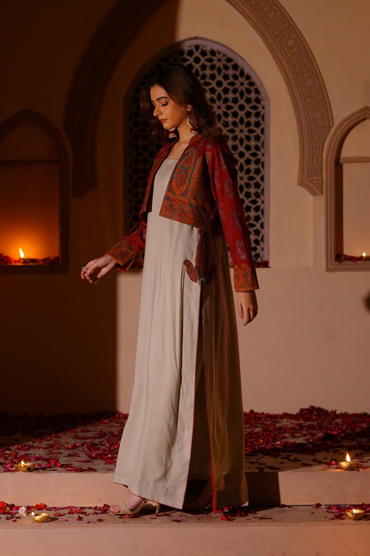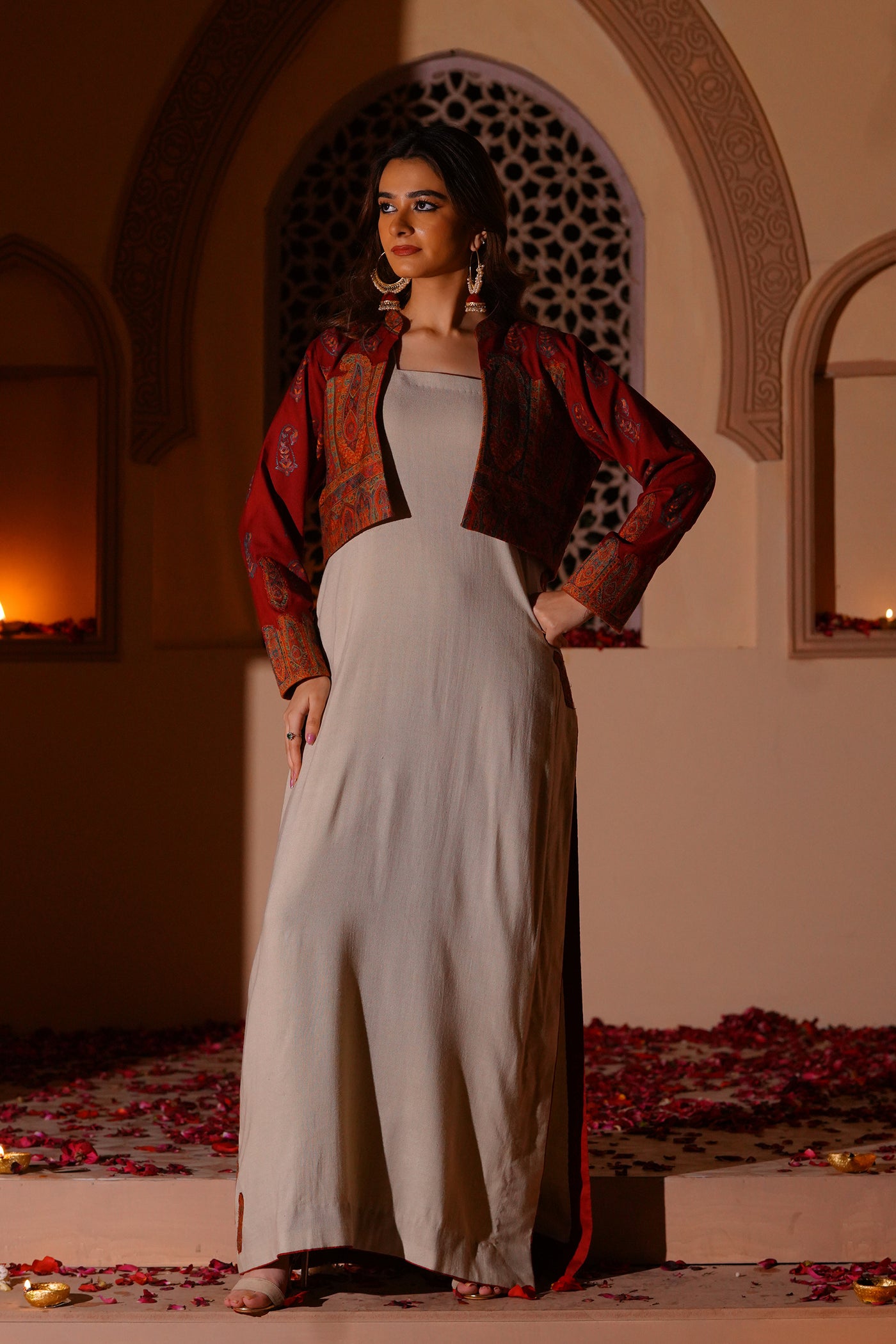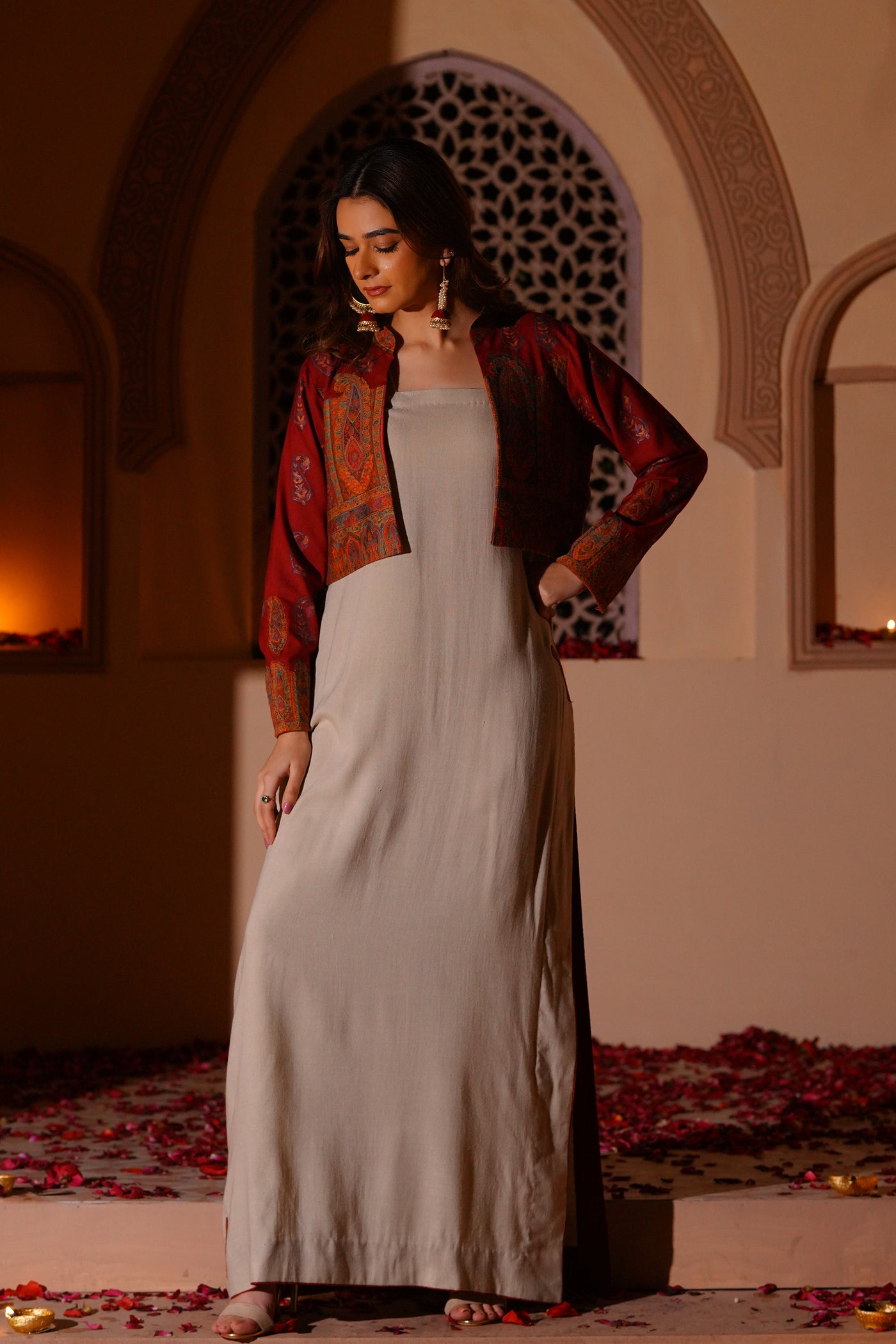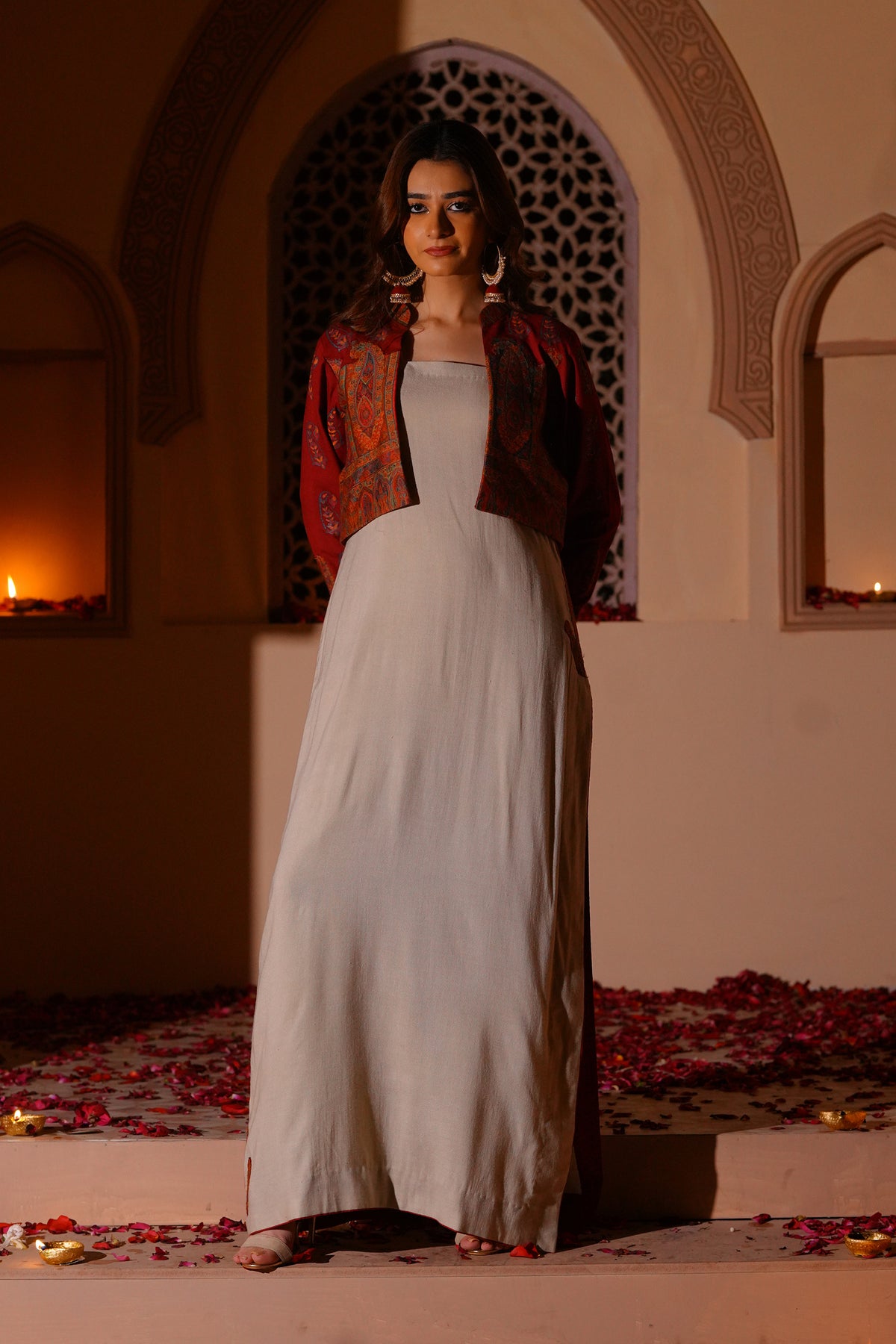 Set in a soft off-white tone, this sleeveless long shirt is defined by its clean, fluid fall. The surface is detailed with intricate kanni appliqué work, subtly embellished to add depth and texture. The silhouette remains simple, allowing the craft to stand out. Layered with a short wool kanni jacket, finished with block printing and appliqué work. A composed interplay of structure, surface, and tradition.