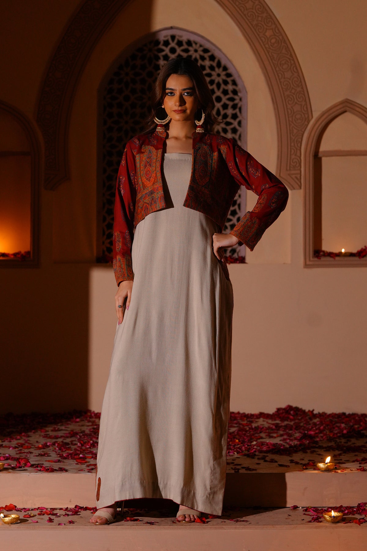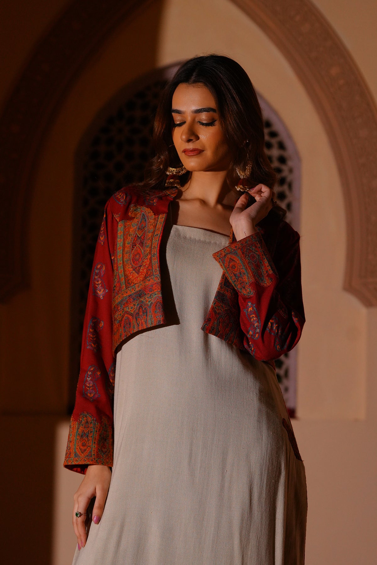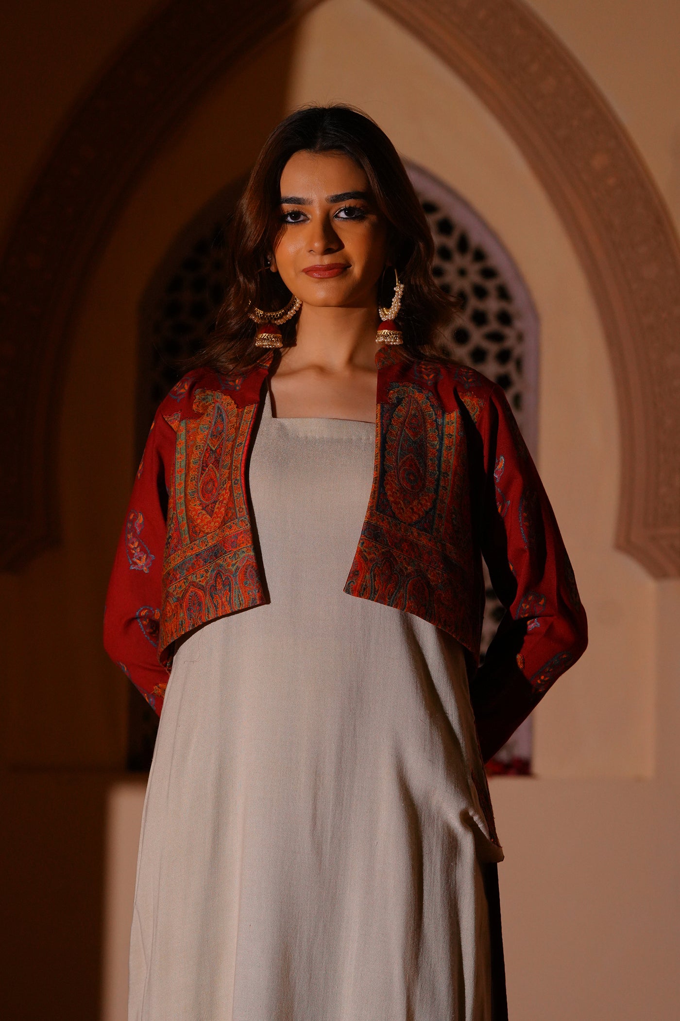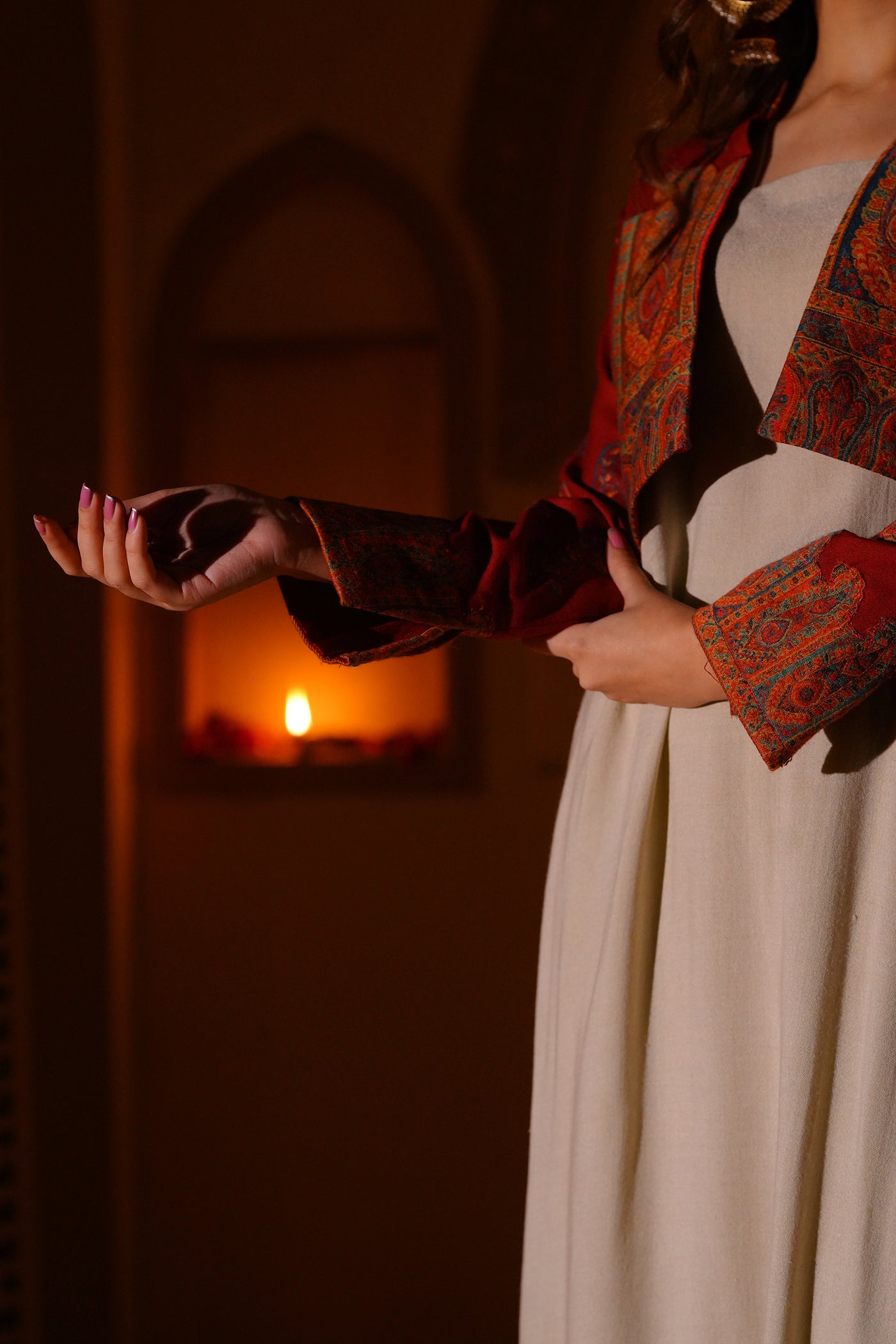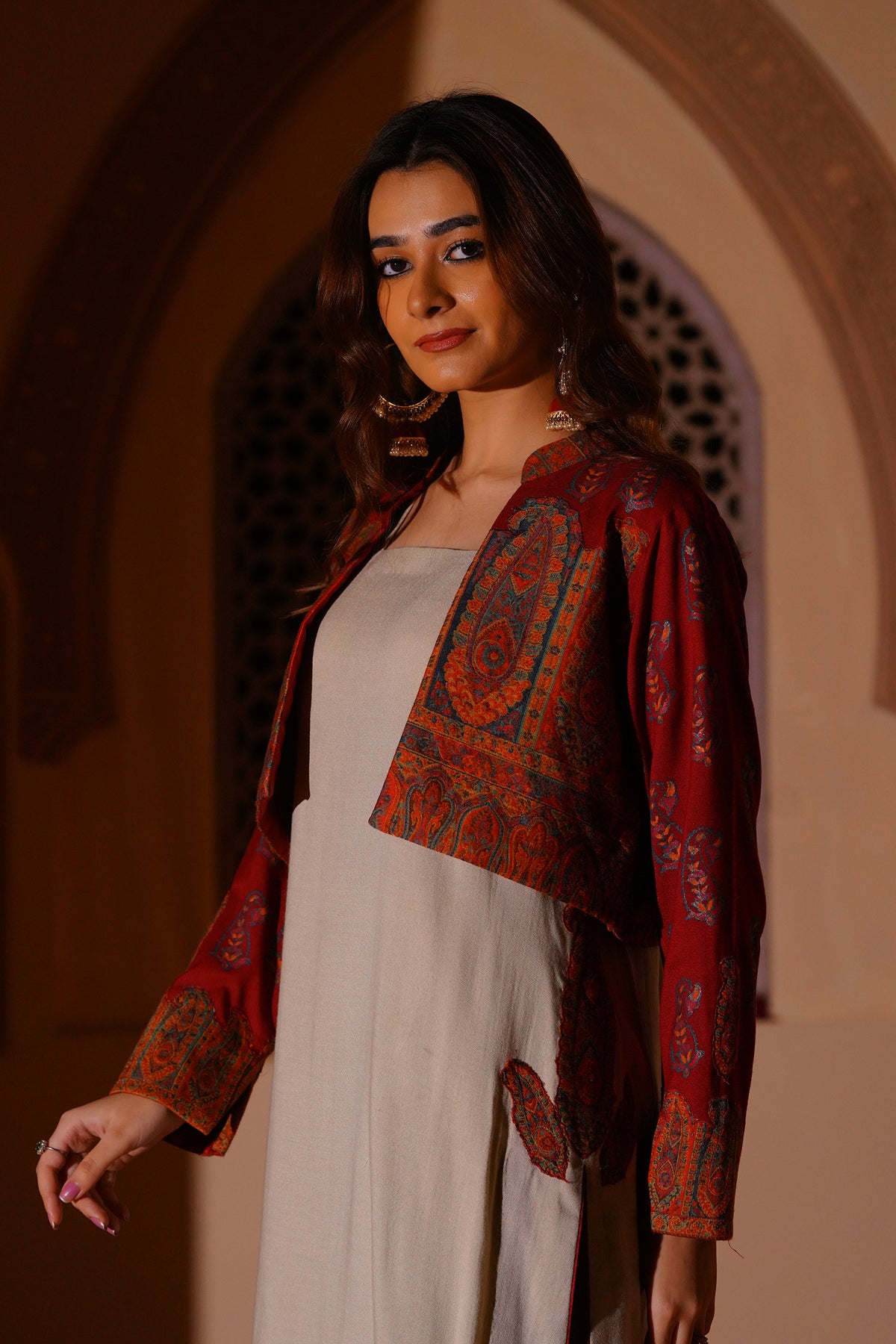 Set in a soft off-white tone, this sleeveless long shirt is defined by its clean, fluid fall. The surface is detailed with intricate kanni appliqué work, subtly embellished to add depth and texture. The silhouette remains simple, allowing the craft to stand out. Layered with a short wool kanni jacket, finished with block printing and appliqué work. A composed interplay of structure, surface, and tradition.